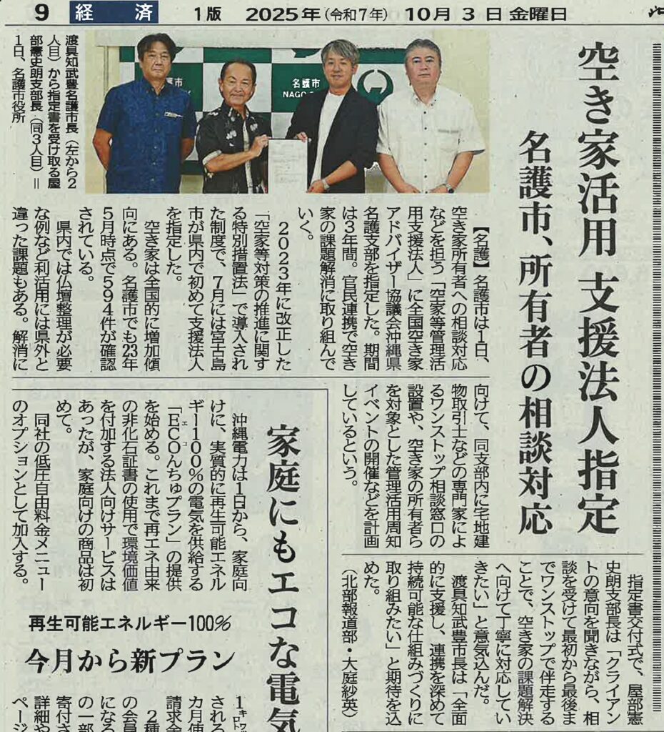 先日の名護市からの「空家等管理活用支援法人」に認定された署名式の取材を掲載してもらいました。